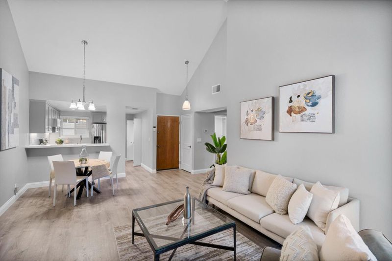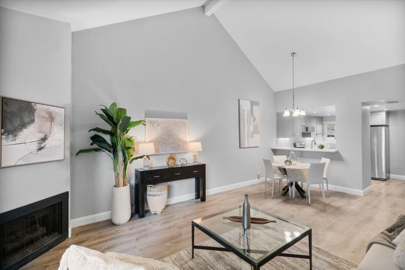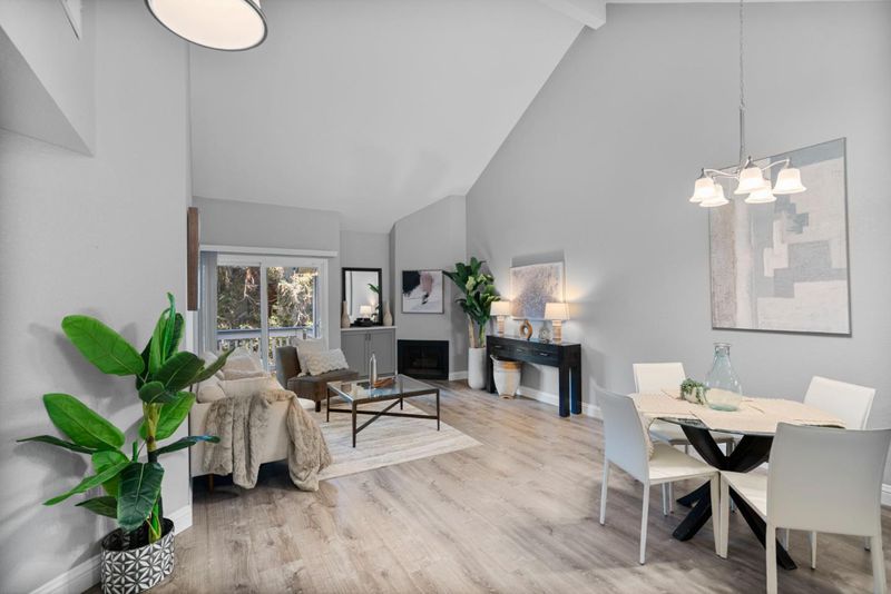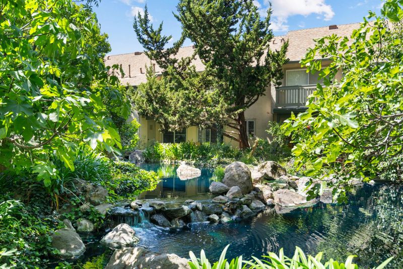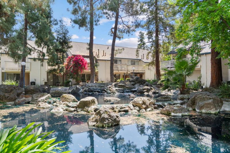 OPPORTUNITY TO OWN FOR CLOSE TO WHAT YOU ARE PAYING IN RENT. | Beautifully maintained 1-bed, 1-bath home offering comfort & convenience in a tranquil, Tahoe like setting; perfect for professionals, first-time buyers, commuters, investors & downsizers. Nestled in a well-kept gated community, this home features modern flooring throughout & a bright, open living space highlighted by a cozy fireplace & cathedral style vaulted ceilings. This spacious living area flows seamlessly to private outdoor space, perfect for relaxing & enjoying serene views of the community's lush landscaping, tranquil ponds & mature redwoods. The updated kitchen is equipped with stainless steel appliances, generous quartzite countertop space & ample storage w/under cabinet lighting. The bedroom offers a comfortable retreat with a large closet & high ceilings, while the home includes the convenience of an in-unit full-size washer & dryer. Community amenities feature a swimming pool, tennis courts, scenic walking paths & peaceful water features. HOA covers water, garbage, roof, exterior maintenance & cable TV w/DVR, providing added value & ease of ownership. Quick access to major routes (101, 280, 680, 87) & just minutes from shopping, dining & essentials | DONT MISS THIS AFFORDABLE ENTRY INTO SILICON VALLEY.