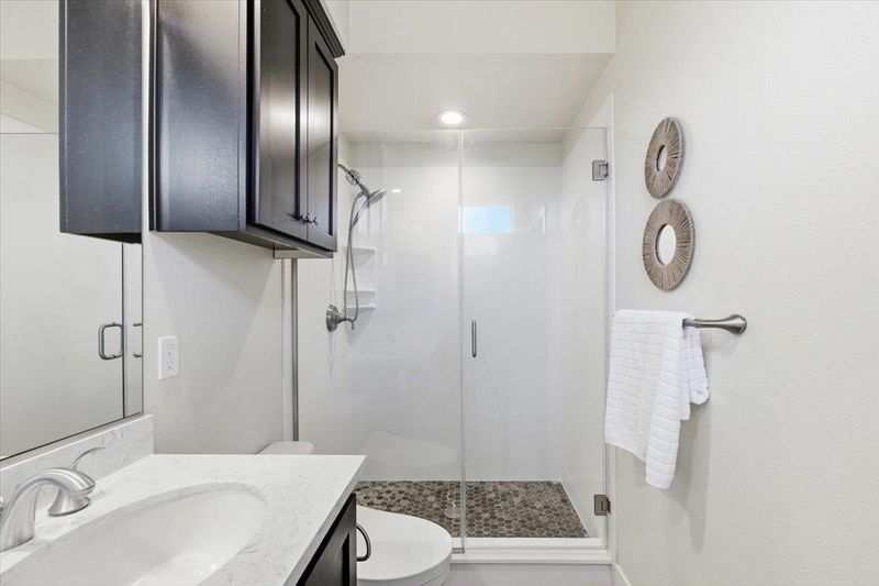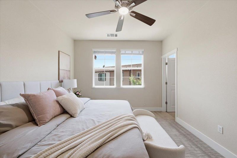 Beautifully appointed 3-bedroom townhome with a versatile bonus room, ideally situated on a premium lot within a serene, private courtyard surrounded by lush greenery. this residence showcases thoughtful design and high-end upgrades throughout. The main level features a gourmet kitchen with a large center island, quartz countertops, full-height backsplash, stainless steel appliances, and abundant cabinetry seamlessly flowing into the open-concept living and dining areas. Elegant hardwood flooring and a stylish wood accent wall add warmth and character. Enjoy indoor-outdoor living with a private balcony overlooking tranquil garden views. Upstairs, the spacious primary suite offers a walk-in closet, dual-sink vanity a large shower, accompanied by two well-proportioned secondary bedrooms.The ground-level bonus room provides exceptional flexibility perfect as a guest suite, home or office. Additional highlights include HVAC,Hunter Douglas ® blinds throughout, a side-by-side two-car garage. Low HOA dues cover building insurance, garbage ,water and community amenities. Ideally located near Downtown Sunnyvale, Caltrain, and major tech campuses, Convenient Google & Meta shuttle stop just downstairs, this home delivers the perfect blend of comfort, convenience, and exceptional value.