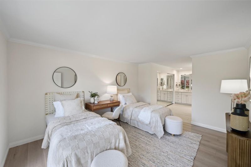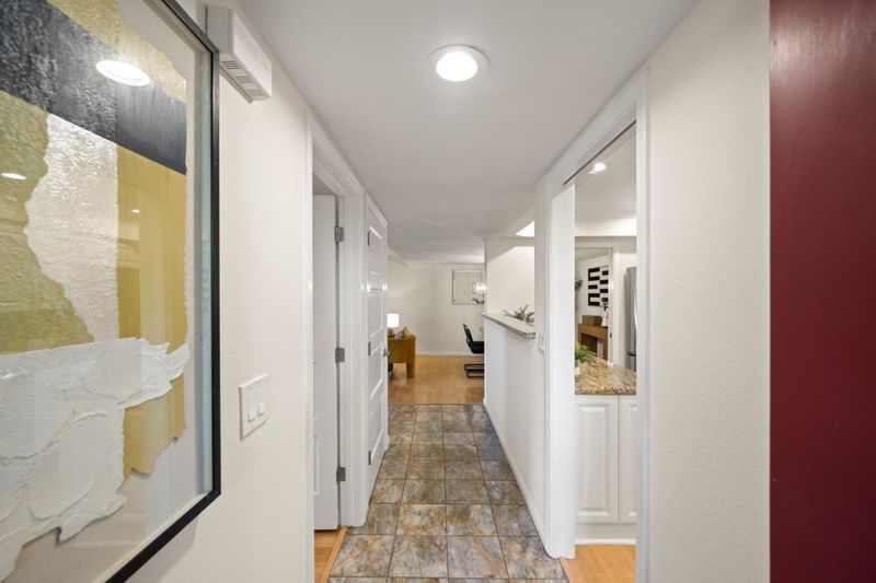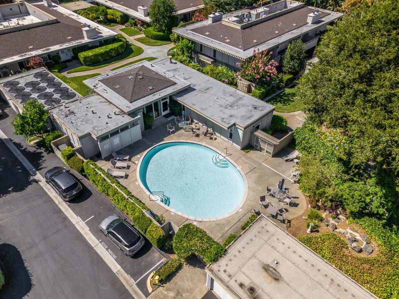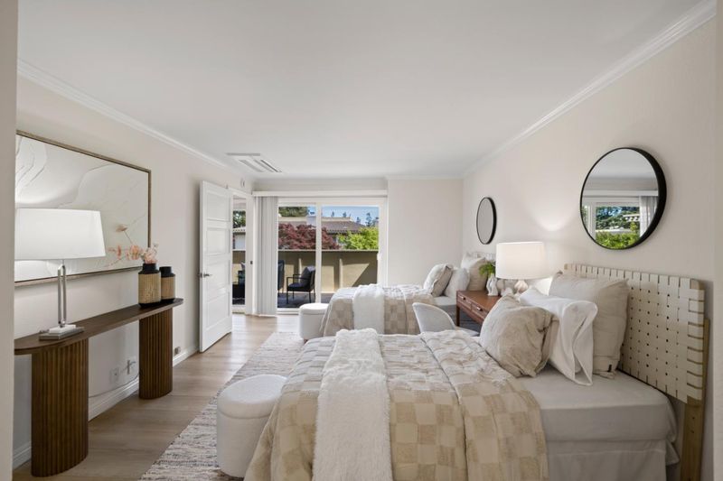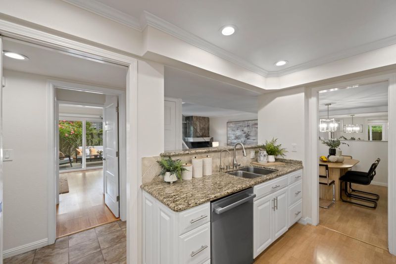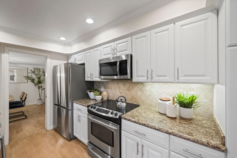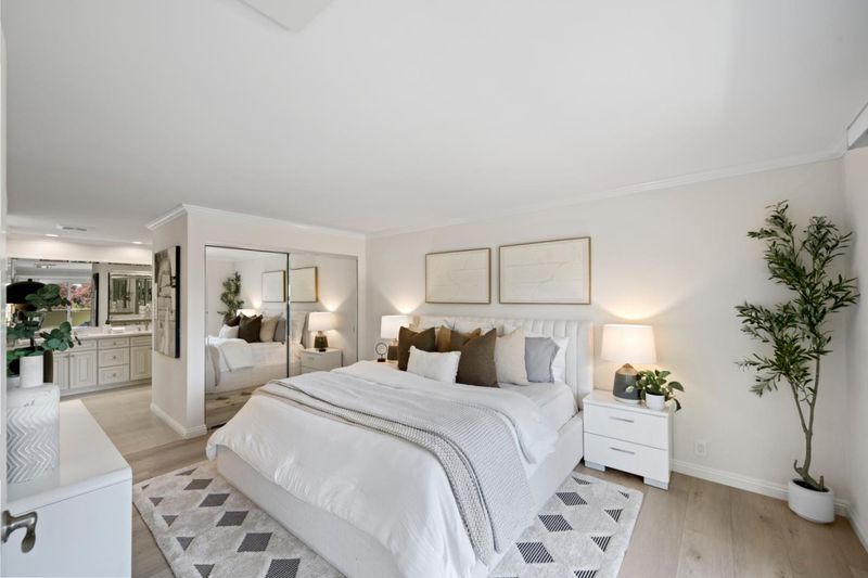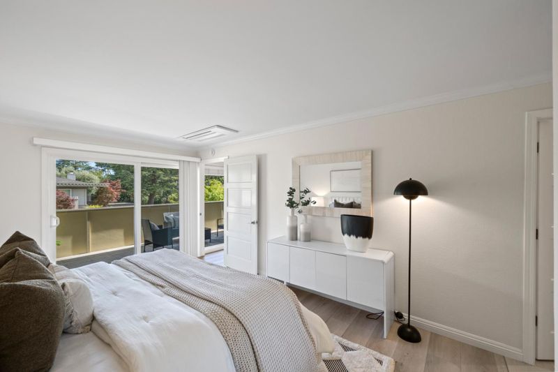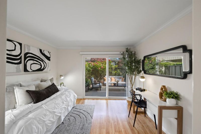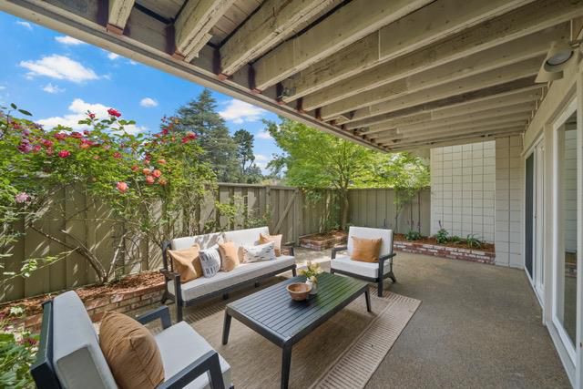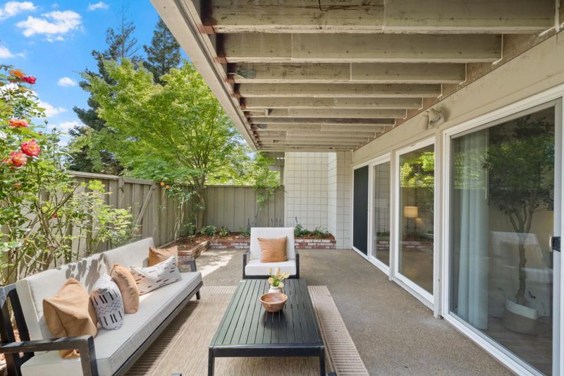 Stunning 3-bedroom end-unit townhome with a beautiful backyard patio, private balcony, and highly desirable ground-floor bedroom. Nestled in a gated community, this beautifully updated home offers comfort, style, privacy, and convenience with top Los Altos Schools. The thoughtfully designed layout includes two spacious en-suite bedrooms plus a versatile main floor third bedroom or office. Filled with natural light from large windows, sliding doors, and skylights, the home showcases beautiful flooring, floating stairs, glass railing, and a cozy fireplace. The updated kitchen features granite countertops, upgraded stainless steel appliances, and opens to both front and back patios for easy indoor-outdoor living. Both en-suite bedrooms offer mirrored closets, updated bathrooms, and efficient mini-split heating and air conditioning systems for personalized comfort. Additional highlights include a detached two-car garage, interior laundry, and access to Los Altos Squares resort-style amenities, including three pools, a sauna, clubhouse, and abundant fruit trees. Ideally located near Whole Foods, Trader Joes, The Village at San Antonio, Starbucks, Coupa Café, Caltrain, shops, restaurants, and top-rated schools including Almond, Egan, and Los Altos High (buyer to verify).