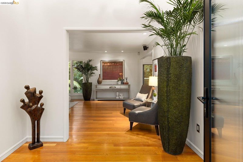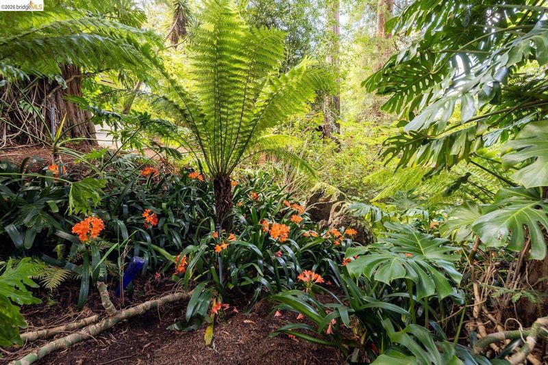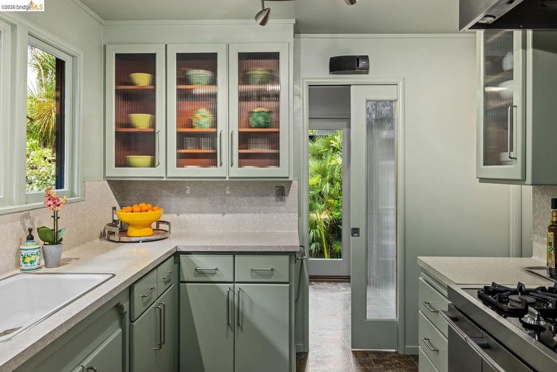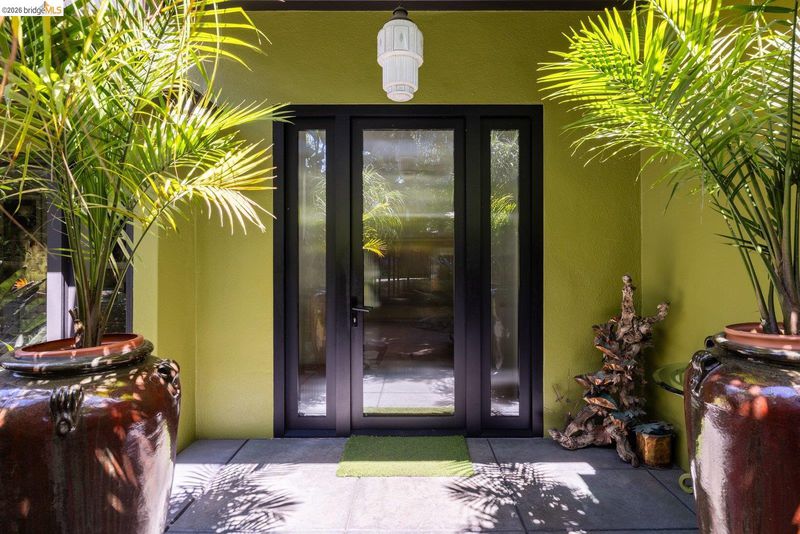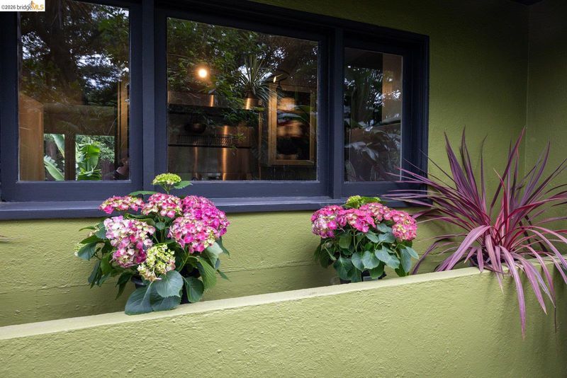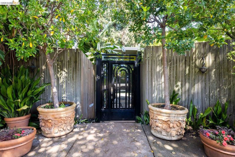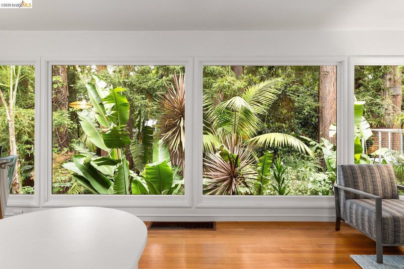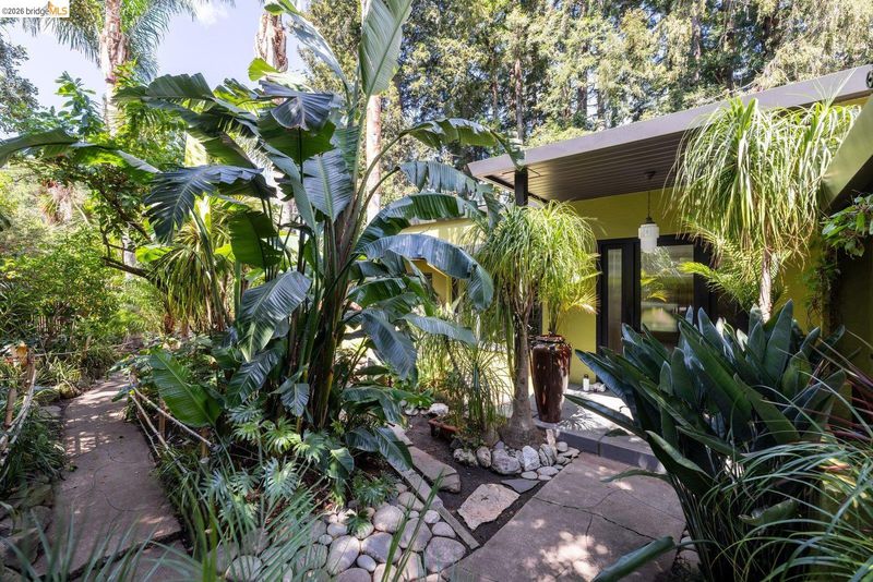 Escape to your own mid-century modern garden retreat! This unique gem combines timeless elegance with natural beauty, offering a private sanctuary perfect for relaxing or entertaining. Located on a small cul-de-sac, it features meandering pathways through botanical splendor, a serene creek, tranquil fountains, greenhouse, a gas grill patio, and a soothing hot tub deck. The single-level layout features walls of glass that frame breathtaking garden views. Gleaming hardwood floors flow throughout, including a cozy den with a fireplace and spa deck access. The kitchen blends vintage charm with modern functionality, showcasing fluted glass cabinets, updated appliances, and retro touches. Even the bathroom carries that intentional mid-century character. A laundry room and standing-room basement add extra functionality. Just minutes from Joaquin Miller Park, Montclair Village, and Route 13, this home balances seclusion with easy access to nearby amenities.