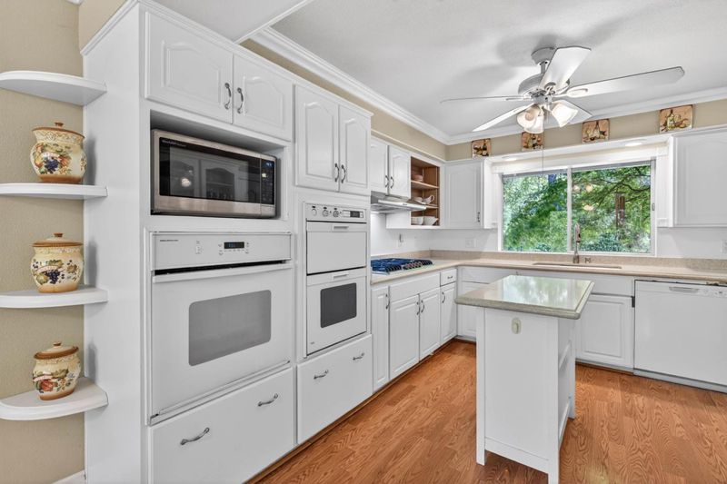 - Cooktop - Gas, Countertop - Granite, Dishwasher, Exhaust Fan, Garbage Disposal, Hood Over Range, Island, Microwave, Oven - Double, Oven - Electric, Pantry