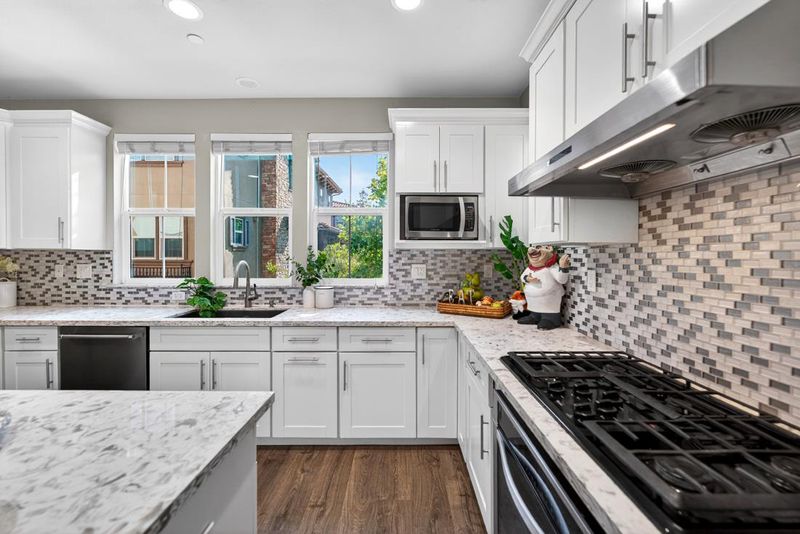 - Countertop - Tile, Dishwasher, Cooktop - Gas, Hood Over Range, Island, Microwave, Exhaust Fan, Refrigerator