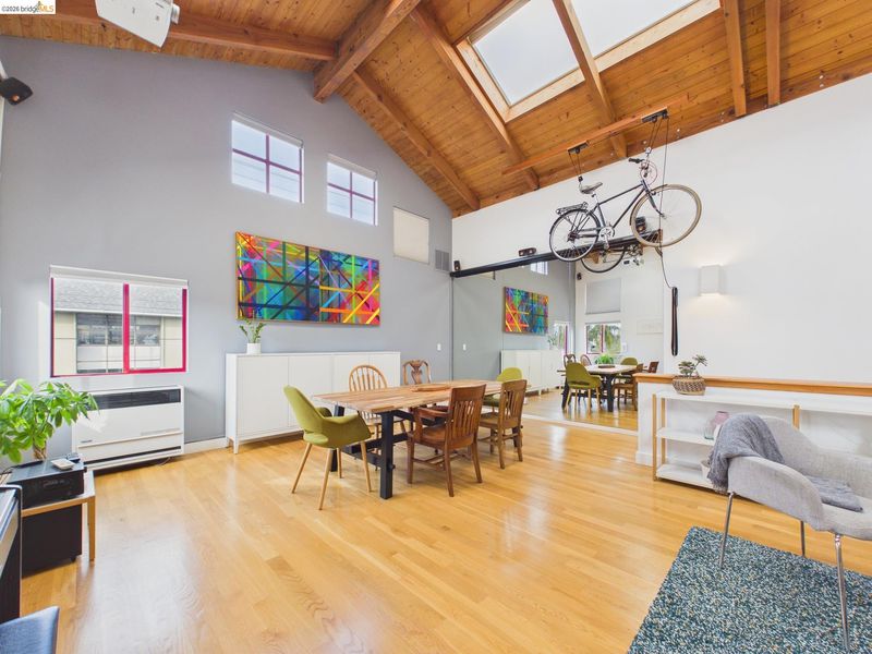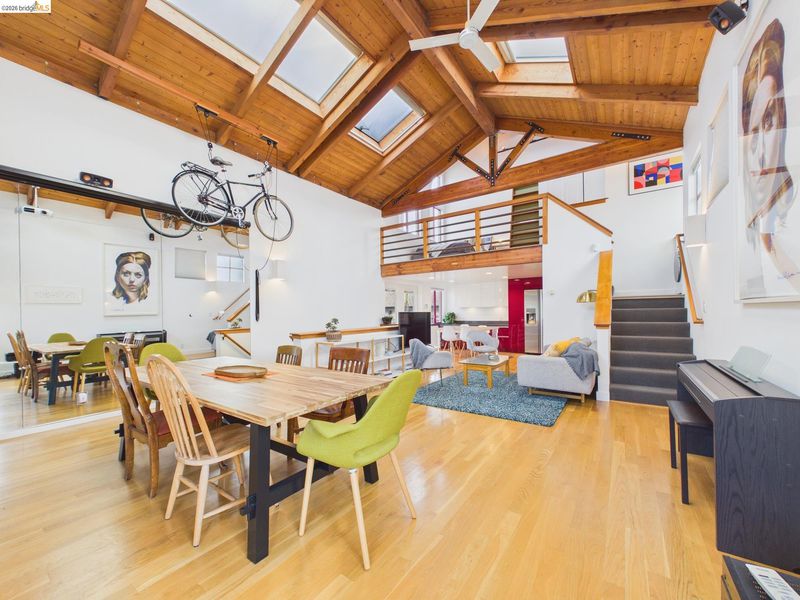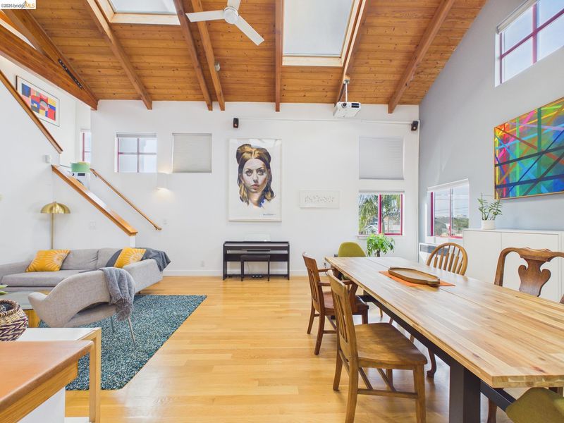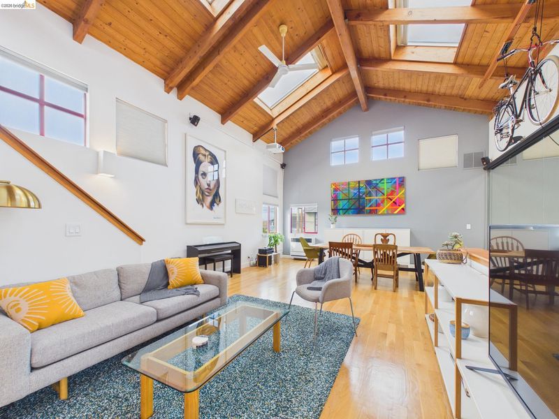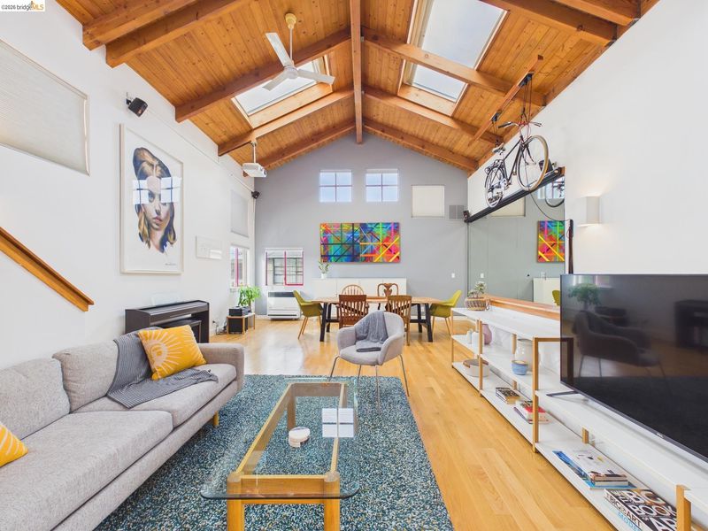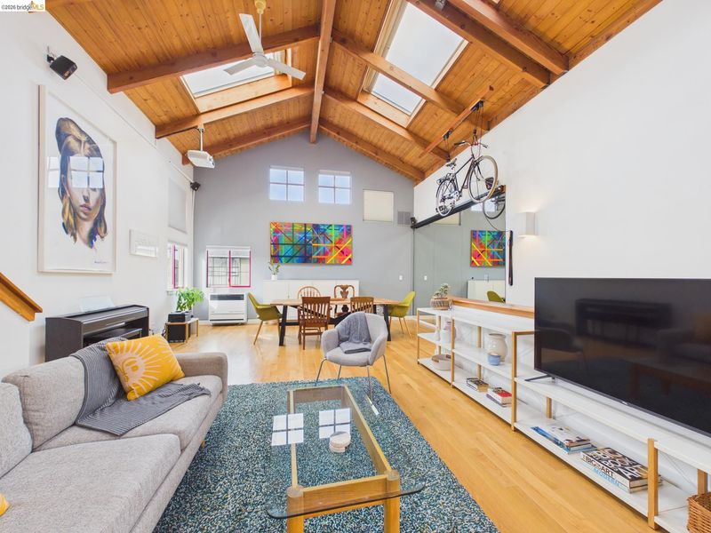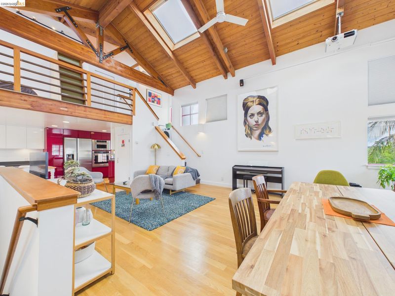 A rare fusion of Italian-inspired design and live/work functionality, this striking 1,636 sq ft loft condominium unfolds across three light-drenched floors in one of Oakland's most characterful communities. Soaring vaulted ceilings with exposed wood beam trusses set a dramatic stage — the kind of volume that invites creativity, complete with electrical connections in the rafters for studio or shop equipment. The showpiece kitchen dazzles with high-gloss crimson cabinetry, premium stainless appliances, and a chic dining space ideal for entertaining. Upstairs, the loft bedroom suite offers an intimate cathedral retreat with skylights and warm wood finishes. The flexible first-floor studio — with its own private entrance, kitchenette, and stacked laundry — functions seamlessly as a guest suite or creative studio. Outside, a lush shared courtyard with mature palms and a fountain creates a serene urban oasis.From the custom home theater to gleaming hardwood floors, every inch has been thoughtfully curated.