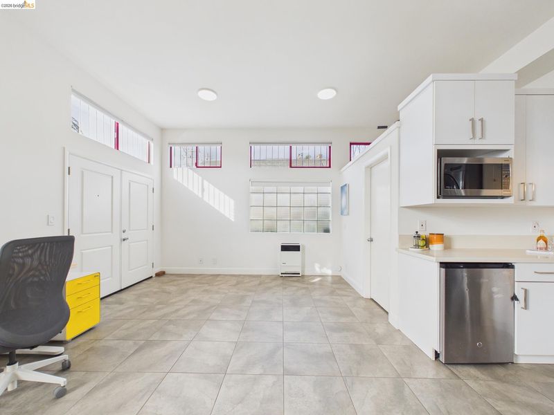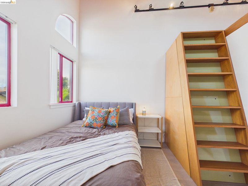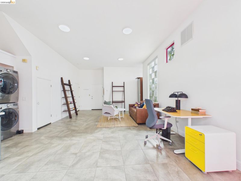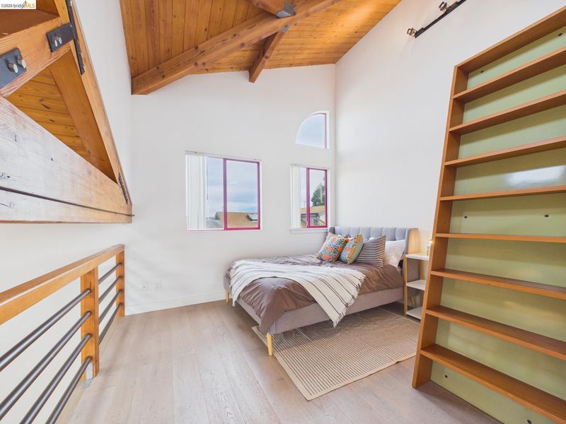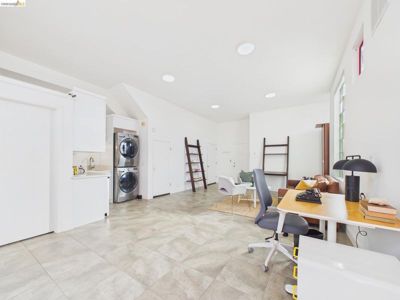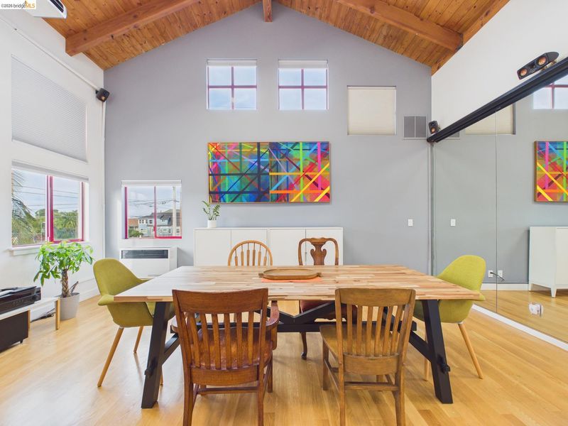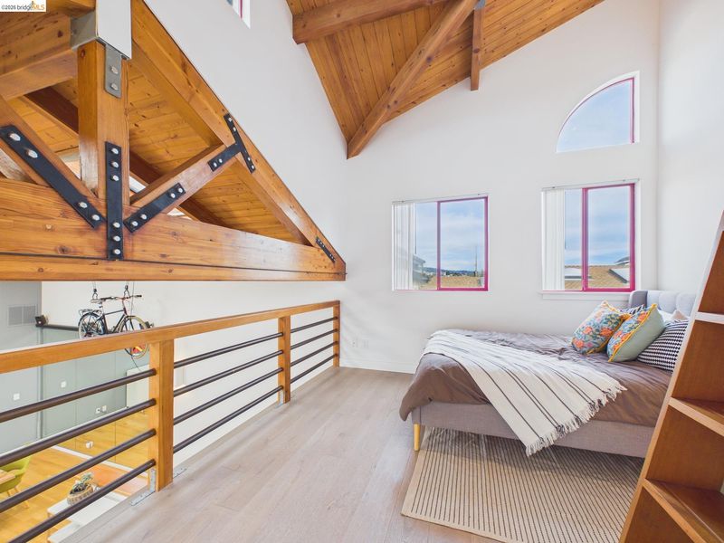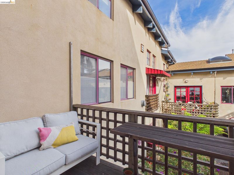 A rare fusion of Italian-inspired design and live/work functionality, this striking 1,636 sq ft loft condominium unfolds across three light-drenched floors in one of Oakland's most characterful communities. Soaring vaulted ceilings with exposed wood beam trusses set a dramatic stage — the kind of volume that invites creativity, complete with electrical connections in the rafters for studio or shop equipment. The showpiece kitchen dazzles with high-gloss crimson cabinetry, premium stainless appliances, and a chic dining space ideal for entertaining. Upstairs, the loft bedroom suite offers an intimate cathedral retreat with skylights and warm wood finishes. The flexible first-floor studio — with its own private entrance, kitchenette, and stacked laundry — functions seamlessly as a guest suite or creative studio. Outside, a lush shared courtyard with mature palms and a fountain creates a serene urban oasis.From the custom home theater to gleaming hardwood floors, every inch has been thoughtfully curated.
