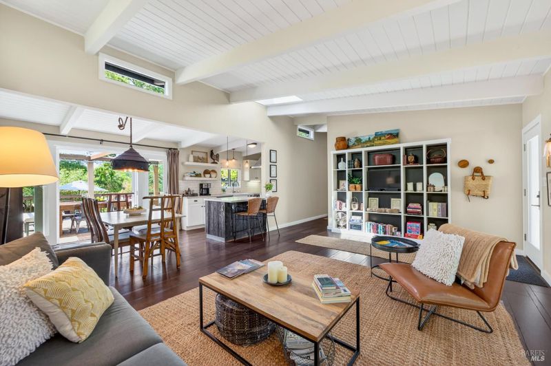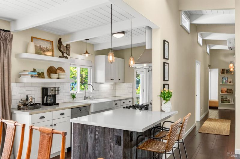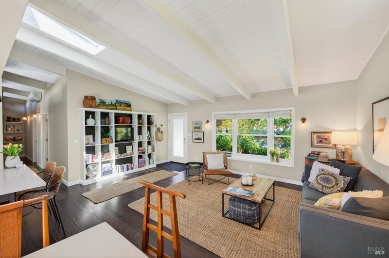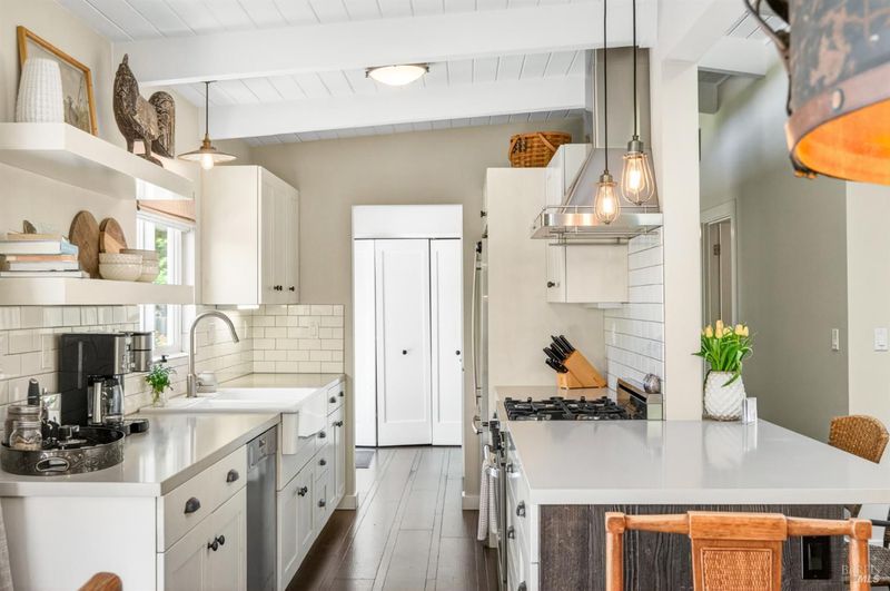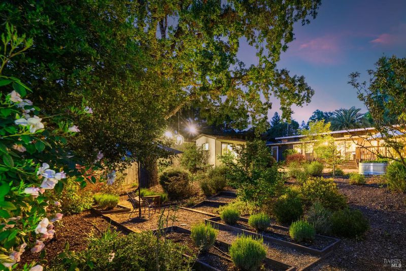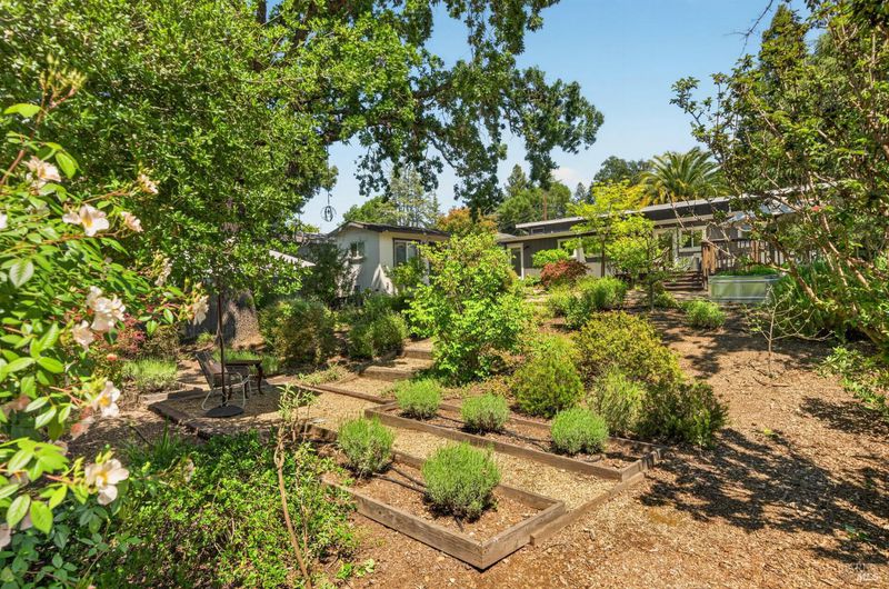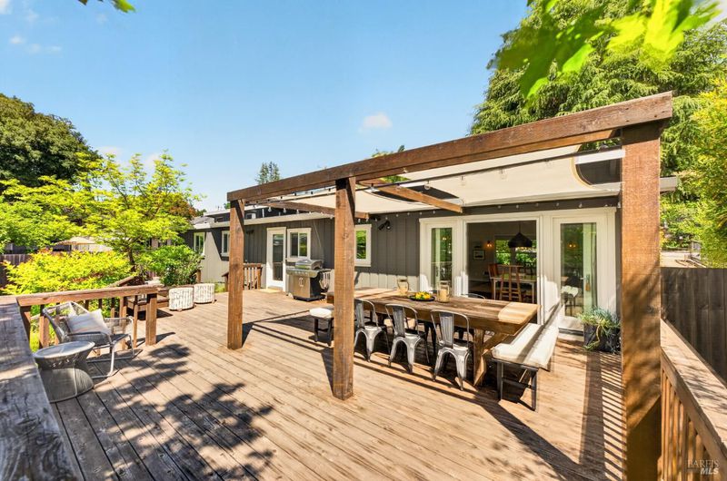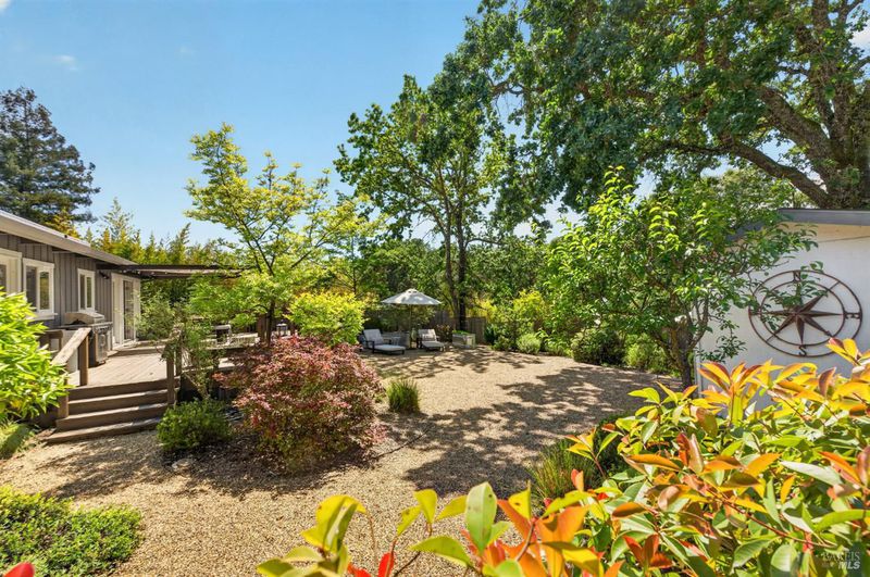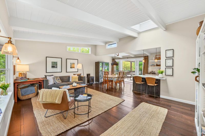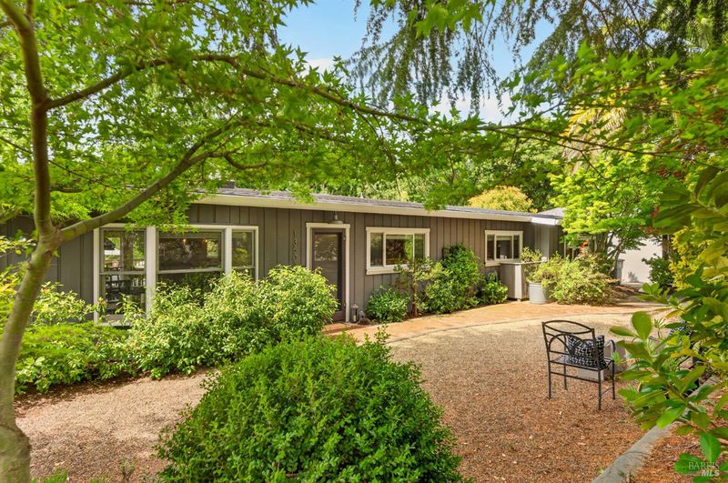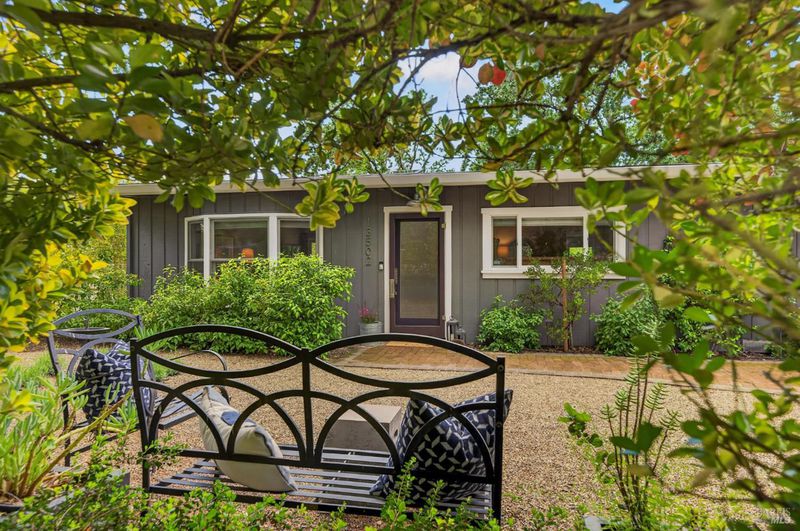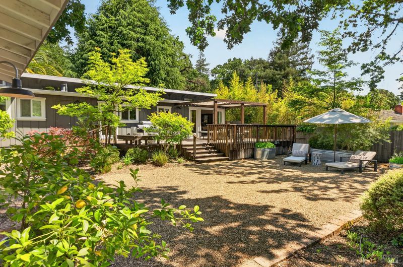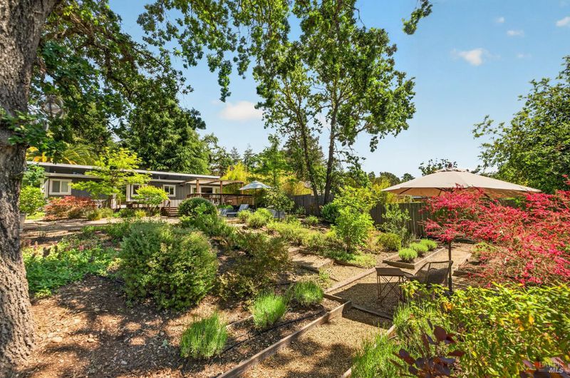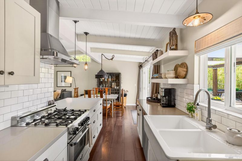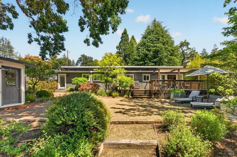 Tucked along a downtown Glen Ellen lane, this beautifully renovated 1954 Mid-Century Modern delivers 3 bedrooms, 2 baths, and an effortless indoor-outdoor flow on approximately 1/3 acre with Sonoma Mountain views. Just blocks from acclaimed restaurants, tasting rooms, a French bakery and gourmet market, the location is as compelling as the home itself. Inside, soaring beam ceilings, skylights, smooth walls, a bay window, and plank flooring create a crisp, contemporary feel, while the stylish kitchen pairs a Bertazzoni range, double farm sink, soft-close cabinetry, Miele dishwasher, and pantry with everyday function. The expansive primary suite accesses the grounds, and both baths have been freshly updated with sleek tile and glass showers. Outside, lush gardens, a generous entertaining deck with custom shade, and room for a pool invite relaxed Sonoma living, with space for lounging, gardening, and play, plus a storage building and public utilities. Sophisticated, refreshed, and move-in ready, this is Glen Ellen living with a modern edge.